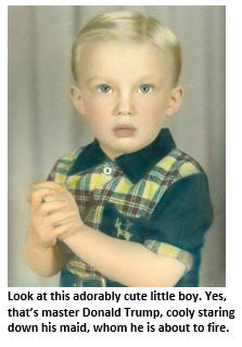 At age eight, Donald had difficulty making friends. Later in life he would overcome this affliction by amassing enough wealth simply to buy them. He conquered his childhood insecurities by becoming a master deal maker. He had half the third grade on his payroll doing his homework while he watched Captain Kangaroo, clinging to his blankie. If his minions scored him an A, he’d pay them in candy he’d “borrowed” from the neighborhood grocery store. Over time, kids started complaining he wasn’t paying them the candy they were owed. But Donald knew that these kids were all liars and had done a sloppy job on his homework, so he had a right to stiff them.