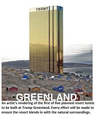 At a press conference, the president’s newly appointed Prime Minister of Greenland, Ivanka, unveiled a gorgeous architectural rendering of the planned resort, which will feature two tasteful 60-foot giant gold-plated whale statues at the main entrance, blowing poker chips out of their blowholes into a glacier-fed fountain. She announced that construction is expected to begin just as soon as the engineers can figure out how to load the 20’x30’ hotel windowpanes onto dog sleds.