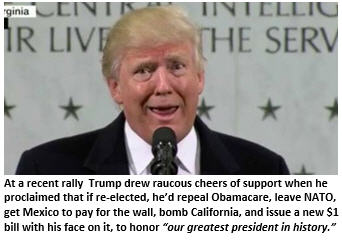 With Attorney General William Barr at his side, Trump has announced that henceforth all Justice Department employees will be required to take an Oath of Allegiance – to President Trump. The oath includes a gag order to never become a whistleblower – unless they have the goods on a Democratic member of Congress, in which case, they will receive a $15,000 tax refund and box of Trump Steaks.
